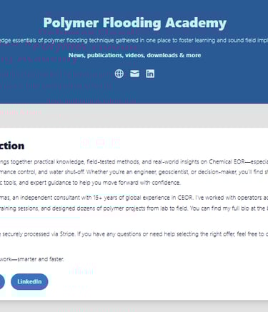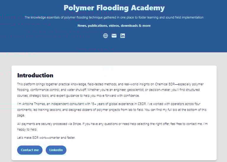 Go beyond the website — access our Polymer Flooding Academy, watch in-depth sessions on our YouTube channel, and explore practical tools and resources to deepen your understanding of EOR, water shut-off, and conformance.